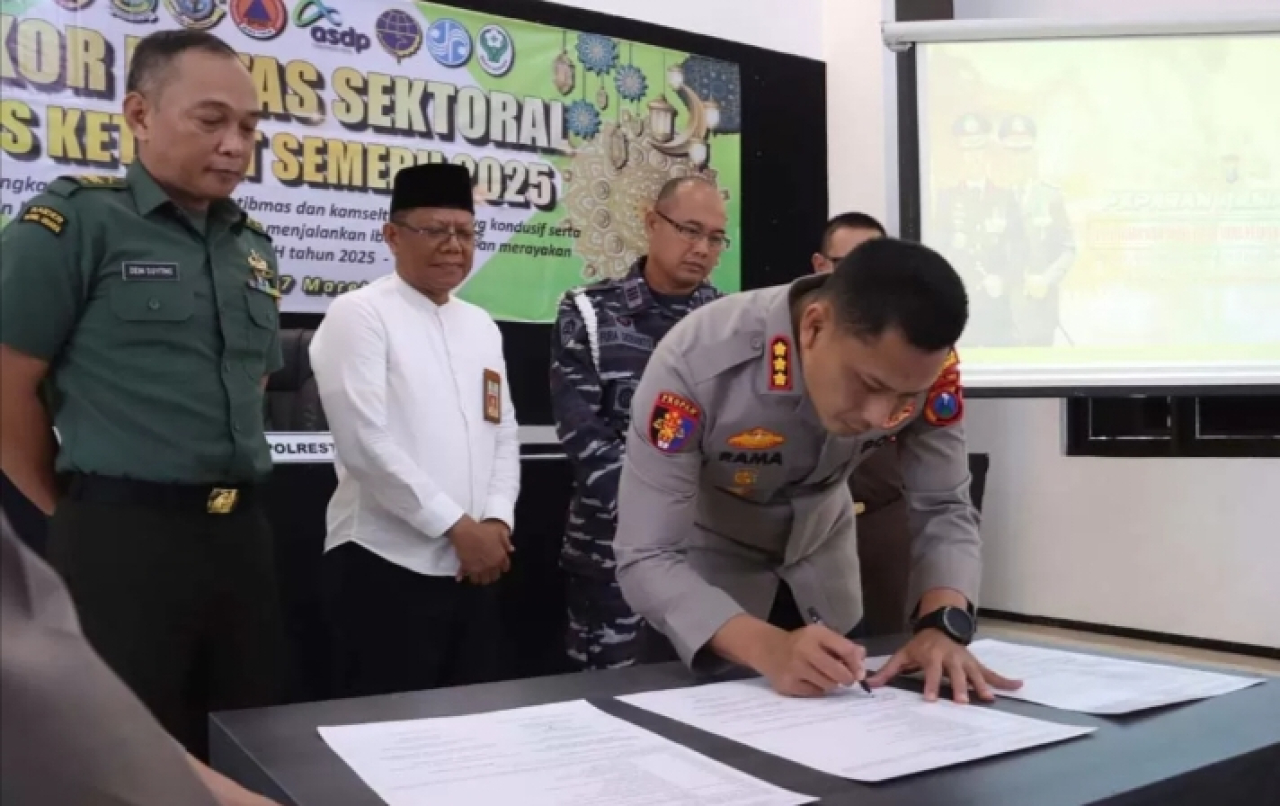 Sebelum rakor dimulai, perwakilan elemen membubuhkan tanda tangan sebagai bentuk dukungan untuk pelayanan terbaik yang dilakukan Polresta Banyuwangi.