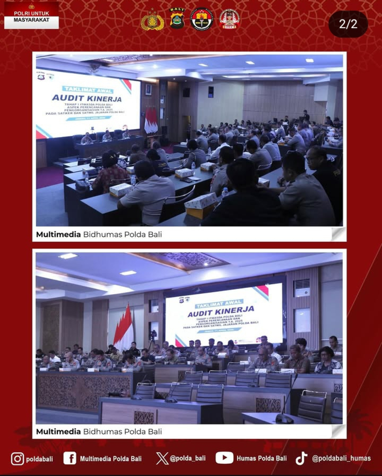 "Oleh karena itu, Itwasda Polda Bali sebagai pengemban fungsi_Quality Insurance_ secara rutin melaksanakan kegiatan audit kinerja yang dilaksanakan 2 kali dalam 1 tahun. Pada semester pertama di tahun 2025 ini, Itwasda Polda Bali akan melaksanakan kegiatan Audit Kinerja Tahap I pada Aspek Perencanaan dan Pengorganisasian," sambungnya.