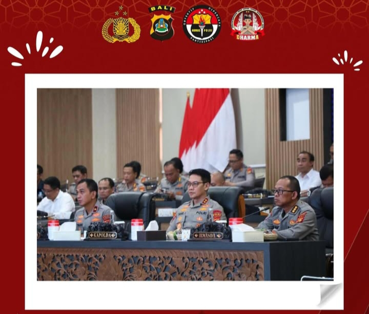 Denpasar, Bali |bnews.click,- Kapolda Bali, Irjen Pol. Daniel Adityajaya, S.I.K., M.Si., didampingi oleh Wakapolda Bali Brigjen. Pol. I Komang Sandi Arsana, S.I.K, M.H. Dan Pejabat Utama Polda Bali menerima arahan dari Kapolri, Jenderal Pol. Drs. Listyo Sigit Prabowo, M.Si. Melalui Video Conference (Vicon). Terkait Kesiapan pengamanan peringatan Hari Buruh Internasional (May Day) yang jatuh pada tanggal 1 Mei. Yang berlangsung diruang Rupatama Polda Bali. Rabu (30/5/2025).